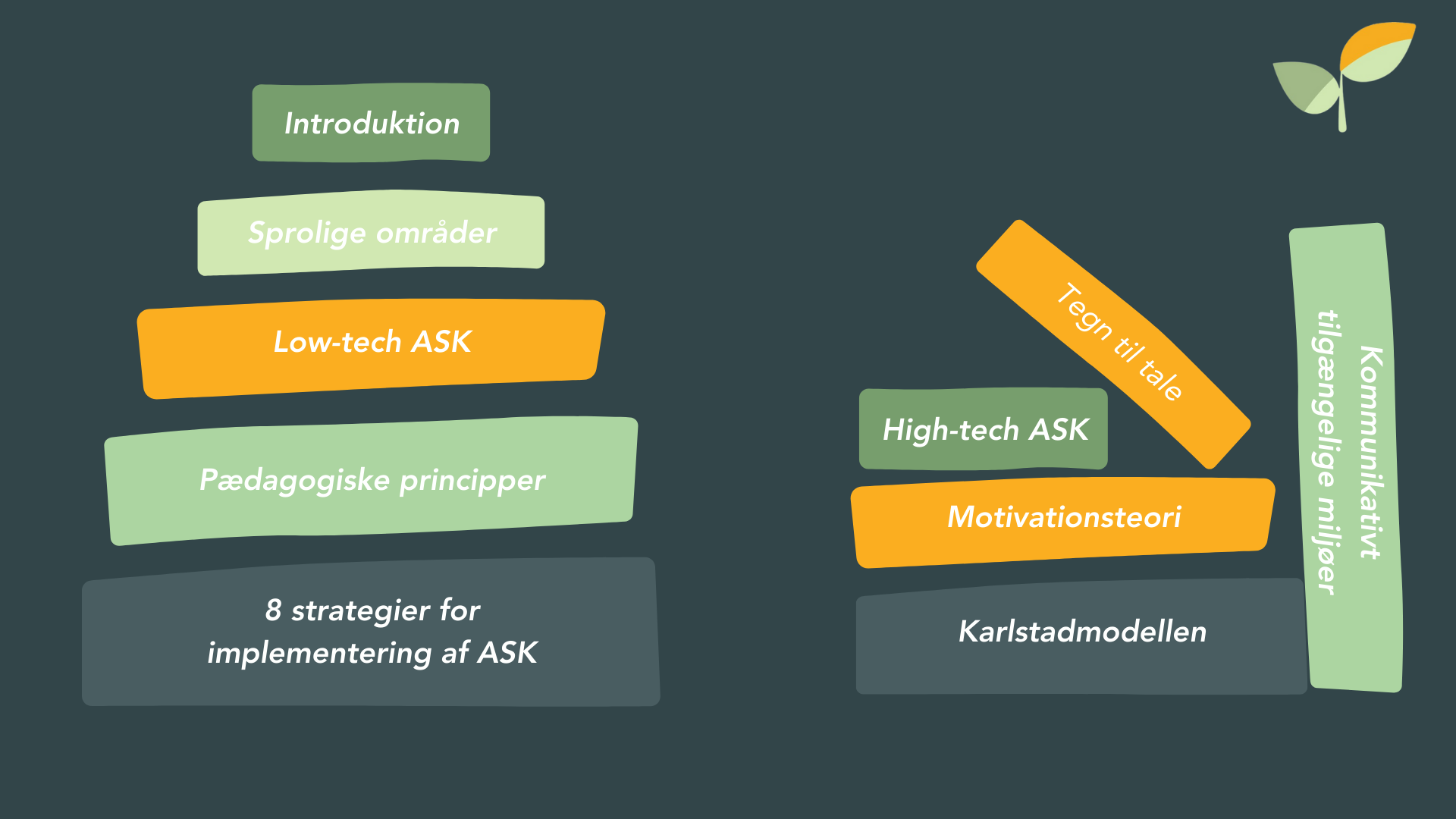 Vi sammensætter vores oplæg ud fra “byggeklodser”, som kan stables forskelligt. Det betyder, at der er mulighed for at skræddersy oplæg. Det vigtigste for os er, at oplægget giver mening for lige netop jer.